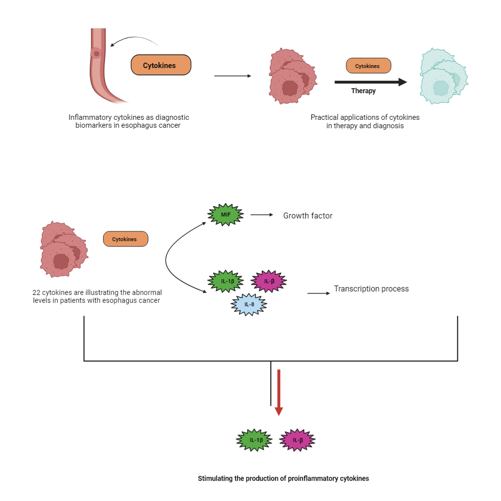 One of the most important types of proteins related to inflammation is cytokines which are considered as potential biomarkers of esophageal cancer. In this way, these biomarkers, near imaging techniques, may be practical in diagnosis and monitoring therapy in the treatment of many malignancies like esophagus cancer. Remarkably, in this article, the importance of cytokines is demonstrated in order to declare it’s practical applications on the dysregulation of cytokines in esophagus cancer and their clinical and pathological implications in diagnosis and also therapy. It is confirmed that twenty-two cytokines are illustrating abnormal levels in patients with esophagus cancer. Correspondingly, MIF is related to regulation growth processes, and IL-1β, IL-6, and IL-8 are related directly to regulation in the transcription process. IL-1β and IL-6 stimulate the production of proinflammatory cytokines. Further research is essential to establish the biological significance of cytokines in esophageal cancer, their potential for early diagnosis, pre-and postoperative prognosis, and monitoring the response to chemotherapy and radiotherapy in cancer patients.