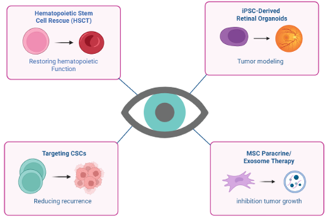 Retinoblastoma (RB), recognized as the most prevalent intraocular malignancy in pediatric populations, continues to pose considerable therapeutic challenges due to its genetic etiology, tumor heterogeneity, and resistance to standard treatment modalities. Recent progress in stem cell biology has introduced innovative approaches for both disease modeling and therapeutic intervention. The utilization of induced pluripotent stem cells (iPSCs) and retinal organoids has enabled the in vitro recapitulation of retinal development and RB pathogenesis, thereby facilitating precision drug screening and elucidation of underlying mechanisms. Additionally, the identification of cancer stem cells (CSCs) within RB has redirected therapeutic strategies toward targeting pathways involved in self-renewal, mechanisms of drug resistance, and tumor propagating cells, to prevent relapse and metastasis. Mesenchymal stem cells (MSCs) have emerged as promising vectors for tumor-targeted therapy, leveraging paracrine effects and exosome-mediated delivery of therapeutic agents, thus offering minimally invasive and systemic approaches to overcoming drug resistance and modulating tumor behavior. Furthermore, hematopoietic stem cell (HSC) rescue has improved the safety profile of high-dose chemotherapy regimens by mitigating treatment-associated toxicities. Collectively, these stem cell-based strategies underscore the multifaceted role of cellular therapies in RB, heralding a future characterized by integrated, personalized, and less invasive therapeutic modalities.