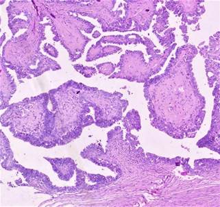 with smooth surface and no papillary excruscences. The right ovary was adherent