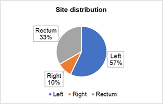 exhibited a predilection for the left colon (57%) and rectum (33%), with