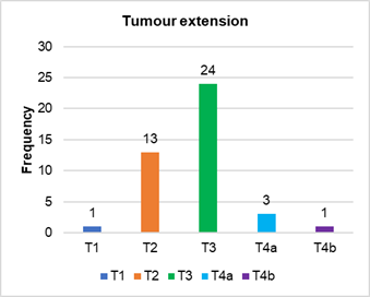 adenocarcinomas, mostly moderately differentiated (57.1%). Tumor extension (T3: