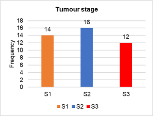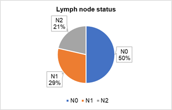 57%) and lymph node involvement (N1: 29%) were prevalent, with Stage II tumors