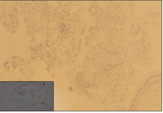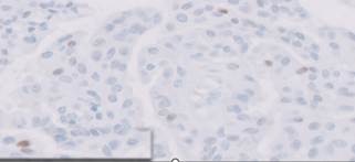 40X, weak to moderate nuclear staining of few cells, inset shows focal strong