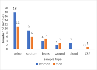 Results: Out of 63 samples under study, 29 samples (46%) from urine, 15 samples