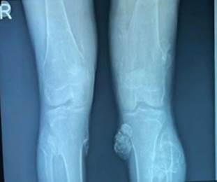 pedunculated exostosis on either side of the distal end of the femur, tibia and