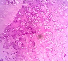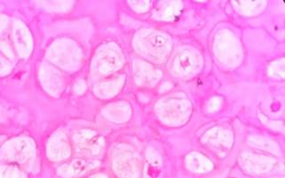 possesses plump chondrocytes showing binucleation-forming nodules with mild
