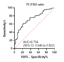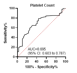 platelet count (PC) had an AUC of 0.695 with 78.7% sensitivity and 56.4%