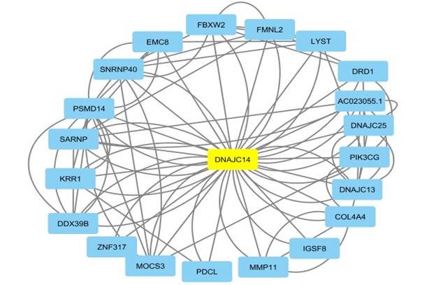 by Cytoscope software, different genes are co-expressed with DNAJC14 gene. Blue